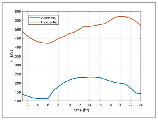 As discussed, the heatmaps in Figure 9 show the trends and peak usage hours for both academic and residential buildings, which are influenced by building utilization by students, staff, and faculty. The peak demand for residential buildings is just under 700 kW in June, while the corresponding peak for academic buildings for the same month of June is close to 280 kW. In Figure 9, the power for residential buildings is shown as being higher than that of academic buildings in both sample months of January and June. The same is illustrated again in Figure 10. This does not contradict the previous data. In the case of Figure 9 and Figure 10, hourly data was only available from January to June for four residential buildings and three academic buildings. Additionally, one of the academic buildings in the hourly dataset has been traditionally shown to consume little power throughout the period. Due to the limitations of the available hourly dataset, it appears that the residential buildings consume more power, but in fact, the academic buildings consume more power as shown in the previous analysis above (Figure 5, Figure 6, Figure 7 and Figure 8) when examining the full daily dataset with all metered academic and residential buildings from January to December 2019.