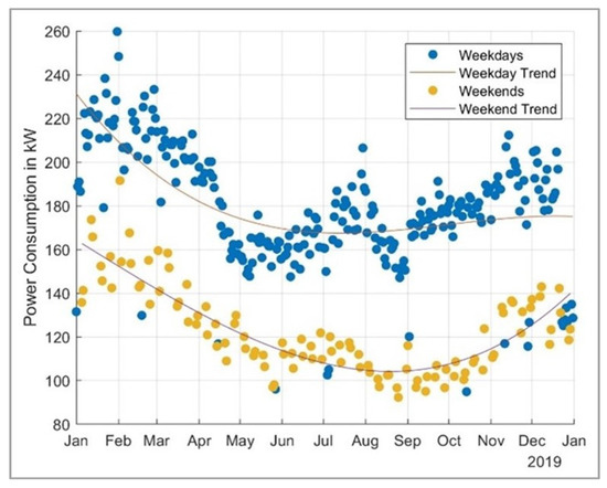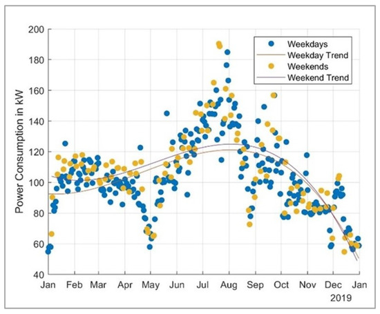 The power consumption pattern of the academic building, Wentworth Hall, is shown in Figure 11. The pattern reinforces the data shown in the aggregated power data for academic buildings (Figure 7) and the heatmap data for academic buildings (Figure 9a,b). This suggests that there is a clear distinction between weekday and weekend power needs for academic buildings. Very few academic buildings are open or accessible during the weekends, and even then, the air conditioning and heating are typically not fully on, which would account for the clear separation between weekdays and weekends. The trendlines show that the gap in power consumption between the two types of days stays roughly the same, approximately 65 kW to 70 kW on average, even as the power consumption changes over the months and semesters. The outliers in weekday data shown in Figure 11 correspond directly to holidays when the academic buildings would have been closed.