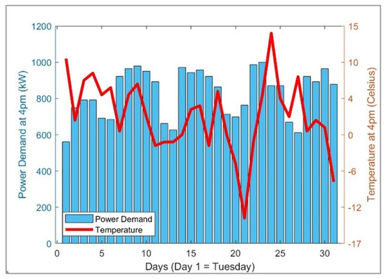 The power demand of the power plant plotted alongside the temperature at 4 pm measured daily in January 2019. The 1st of January that year (Day 1) was a Tuesday.