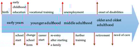 Preventive social policy recognizes that success and risk factors vary across different stages of a person’s life, including early years, young adulthood, middle adulthood, older adulthood and oldest adulthood (Figure 1, blue arrow). Moreover, earlier life stages profoundly influence the opportunities and challenges individuals face in later stages of life. As a result, preventive social policy is oriented towards addressing these various life stages [20,49]. In this sense, preventive social policy pursues a long-term orientated approach to prevention that focuses on the whole life course [36]. Furthermore, transitions between different stages of an individual’s life cycle are the most sensitive for social policy; policymakers, therefore, must pay special attention to the key decisions made at transitions (school start, career start, re-entry after starting a family, and retirement, etc.) (Figure 1, below arrow) in the individual life stages for successful participation, especially in the education and employment system and in social life. Finally, there are proved successes and risk factors that have a particular impact on these transitions and have a considerable (positive or negative) influence on subsequent life stages (Figure 1, above arrow) [20,50]. In essence, preventive social policy recognizes that a person’s life is a dynamic journey with multiple stages, each requiring specific support and opportunities to promote well-being and equal participation. Policymakers must be attuned to the unique challenges and opportunities associated with each life stage to ensure the effectiveness of preventive measures.