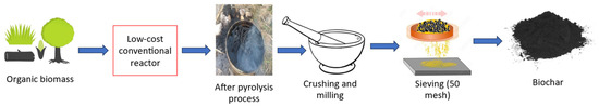 Biochar, a valuable product, was generated using an economical approach from various waste materials, including wood residue and organic substances (Figure 1). The low-cost treatment for generating biochar followed the optimal conditions attained in the previous study, including a low-oxygen environment, gradual pyrolysis within the temperature range of 150–300 °C to craft biochar effectively [20], and a heating speed of 40 °C min−1 [21]. The generated biochar then underwent a crushing process, resulting in finely crushed particles sieved through a 50-mesh shaker. In the context of this research, clamshell waste underwent calcination, transforming the CaCO3 into CaO, as depicted in (1). Other materials, like gravel and sand (collected from Lampung Province, Indonesia), did not involve any preparatory steps and were used in their natural states.