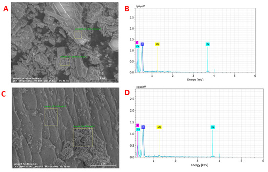 Photographic SEM images of the clamshell before treatment (A); after treatment (C); and along with corresponding EDS mappings (B,D).