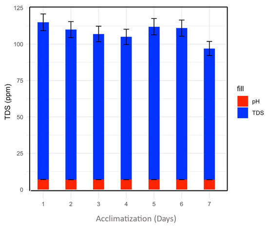 In Figure 5, the pH values observed during the acclimation period ranged from approximately 6.83 to 6.97, reflecting a nearly neutral pH environment. Notably, these values exhibit minimal variation compared to the source pH of the plants (which was measured at 6.44). Additionally, the TDS concentrations recorded throughout the acclimation process ranged from 97 to 115 ppm, showing consistency with the TDS level of the plant’s source environment (measured at 164 ppm). This congruence between the tap water conditions and the plant’s natural habitat suggests that the plants are likely to acclimate well to their new surroundings. The lack of a significant divergence between the characteristics of the tap water and the native environment indicates the plant’s capacity to thrive in the novel setting. It implies that the plants possess an inherent ability to adapt to the changes in pH and TDS levels, increasing their likelihood of survival in this altered habitat. Notably, the metal content was not quantified in this preliminary test due to the absence of notable metal concentrations in either the tap water or the source of the plant.