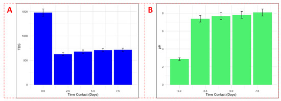 Influence of Contact Time on TDS (A); and pH (B) in AMD (based on five measurement repetitions).