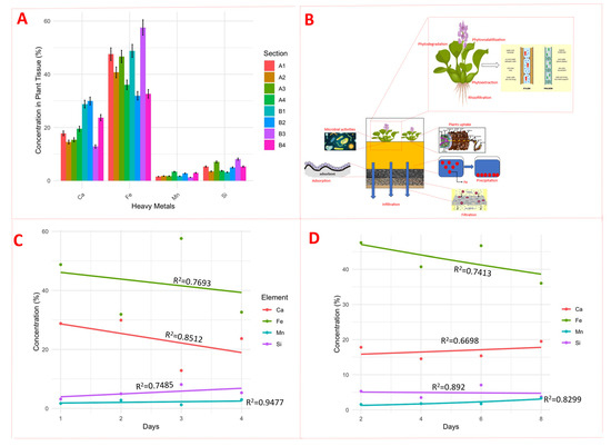 The concentration of Ca, Fe, Mn, and Si n Plants Tissues (A); mechanism of distribution pollutant in CW (B); correlation between time contacts and accumulation of species from the plants after degradation processes in section A (C); and section B (D).