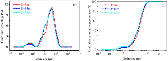 Grain distribution characteristics. (a) Grain size distribution curves; (b) grain size cumulative distribution curves.