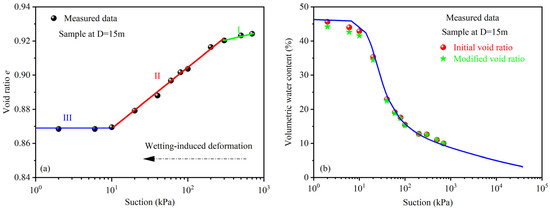 It is worth noting that loess, characterized by its open structure, exhibits a pronounced sensitivity to water and is prone to experiencing collapse deformation during wetting [5,30,31]. Figure 2a reveals that the soil underwent three stages of deformation during wetting. Initially, the deformation remained relatively limited, and subsequently it increased rapidly. While at near saturation (e.g., 0–10 kPa), minimal to no deformation was observed. These findings align with experimental data reported in prior studies [32,33,34]. Pereira and Fredlund [34] have elucidated that unsaturated soil typically undergoes three distinct stages of collapse: the pre-collapse stage, the collapse stage, and the post-collapse stage, in response to the decrease in suction. The pre-collapse stage is characterized by limited elastic volumetric deformation. The subsequent collapse phase is marked by significant volumetric compression in response to decreasing suction or increasing water content. This phase leads to notable alterations in soil structure due to localized shearing of connecting bonds and clay aggregates. The post-collapse phase, manifesting at low suctions, is characterized by minimal to no volumetric deformation.