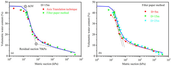 Figure 3a presents a comparative analysis of the wetting SWCC data acquired through both the axis translation technique and the filter paper method for the specimen at a depth of D = 15 m. Notably, the data obtained from these distinct methods exhibit remarkable alignment. This consistency not only underscores the quality and validity of the filter paper method but also underscores the homogeneity of the specimens used in this study.