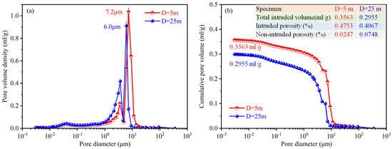 The specimen located at a depth of D = 15 m experienced structural failure during testing, leading to the availability of data exclusively for depths of D = 5 m and D = 25 m. Figure 4 illustrates the pore size distribution (PSD) curve and the cumulative intruded volume curves of the specimens.
