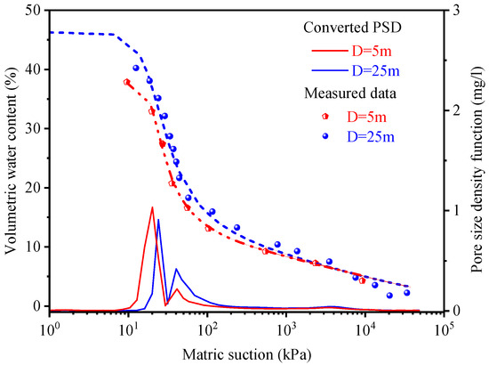 Furthermore, it is crucial to emphasize that the grain compositions of specimens at various depths were nearly identical, as were their fundamental physical properties. The variation in burial depth primarily contributed to differences in dry density and pore structure. This observed influence of burial depth on the SWCC aligns with the influence of dry density, as in the findings reported by Wang et al. [22], Hu et al. [17], and Gao and Sun [16]. However, it is imperative to recognize that significant variations in SWCC and PSD may occur when soils at different depths belong to distinct types (e.g., silt loess, paleosol).