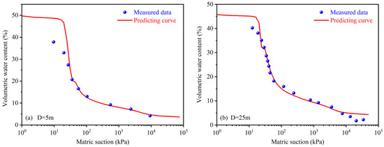 Vm and Vt can be determined through the MIP test. The soil’s SWCC can be derived by combining Equations (1) and (2). The findings are presented in Figure 6, which demonstrates a general alignment between the predicted results and the measured data over a wide suction range. However, it is noteworthy that the predicted results tended to overestimate the soil water content when the suction was less than 10 kPa. This discrepancy was more pronounced in the case of the D = 5 m specimen when compared to the deeper soil at a depth of D = 25 m. This variation may be attributed to wetting-induced soil deformation during the measurement of the SWCC, as illustrated in Figure 2.