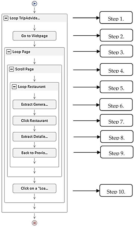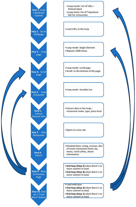 This study comprised the collection of data on restaurants in European Union cities. The data collection was carried out using the Octoparse 8 sustainable instrument, which extracted information from the Tripadvisor.com website. The method used for this data extraction is outlined in Figure 1.