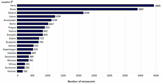 At the data collection stage, significant variations in the quantity of restaurants across the cities under analysis are observed (see Figure 3). Paris, Rome, Madrid, Ljubljana, and Nicosia are among the cities with varying numbers of restaurants. Paris has the highest number of restaurants, with a total of 4435 establishments. Following closely after is Rome, with 3907 restaurants, while Madrid offers a relatively lower count of 2154 restaurants. On the other hand, Ljubljana and Nicosia have the fewest number of restaurants, with just 99 and 51 establishments, respectively (see Table 1).