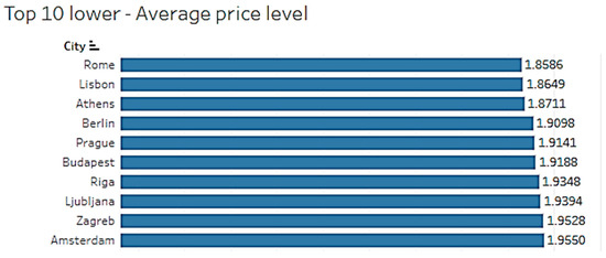 In relation to the examination of the mean price for each capital city, it is evident that relatively minor disparities exist between cities characterised by lower prices, such as Rome (1.85), Lisbon (1.86), and Athens (1.87), as well as Berlin (1.90), and cities where prices are deemed higher, such as Luxembourg City (2.08), Bucharest (2.09), and Helsinki (2.10) (Figure 6).