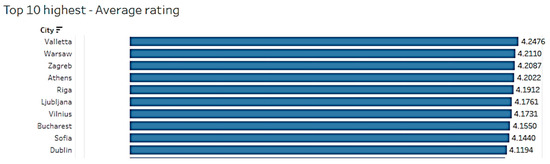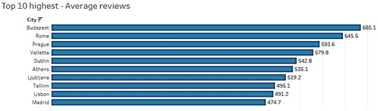 As far as the policy of leaving reviews for restaurants is concerned (Figure 7), we observe quite large differences as follows: in Budapest we have the highest average (685.1) number of reviews per restaurant, followed by Rome (645), Prague (593), and finishing with Helsinki (309.1), Nicosia (301), and Luxembourg City (271.4).