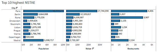 Subsequently, an examination was conducted to assess the correlation between the quantity of restaurants, NSTAE (number of standardised tourist accommodation establishments), and population inside each capital city under analysis (Figure 9).