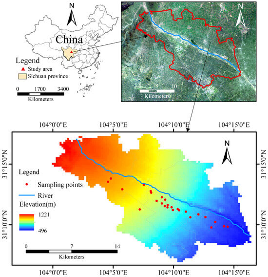 The study area (Figure 1) is located in Shuangsheng Town, 6 km north of Shifang City, and lies at 104°09′ east longitude and 31°10′ north latitude. The area’s elevation is 545.598 m, with a northwest-to-southeast trend, an average elevation of 507 m, and an area of 28 km2. The study area is classified as a plain with green coverage in agricultural or forest areas accounting for most of the area. As a typical agroecological environment, the ecological environment is dominated by agricultural farming, mainly wheat, rice, and legume crops. The Shuangsheng Town Industrial Park is located in the center of the research area, with 31 chemical enterprises. Due to its early establishment and lack of scientific planning and guidance, its development is relatively extensive. In addition, there have been many environmental issues, such as unreasonable industrial structure, low resource utilization rate, and a fragile regional ecological environment.