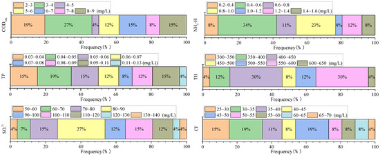 The frequency distributions of the contents of CODMn, NH3-N, TP, TH, SO42−, and Cl in the groundwater samples are shown in Figure 2. The frequency distributions of TP, TH, SO42−, and Cl showed approximately normal distributions, while CODMn and NH3-N did not conform to a normal distribution. This result was consistent with the K-S test results presented in Table 2. The frequency distribution of the TH concentration did not follow a clear normal distribution, and its K-S test value was 0.065, indicating a marginally normal distribution. The mass concentrations of TP, TH, SO42−, and Cl were mainly 0.04–0.09 mg/L, 400–600 mg/L, 70–110 mg/L, and 30–55 mg/L, respectively, and accounted for 77.5%, 79.0%, 83.5%, and 82.5% of the total sampling sites, respectively. The mass concentrations of CODMn were mainly concentrated within 2.5–3.5 mg/L and 6.5–8.5 mg/L, accounting for 85% of the sample sites. The mass concentrations of NH3-N ranged from 0.45 to 1.0 mg/L, with a proportion of 61.5% among the total sampling sites.