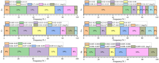 The frequency distributions of the contents of heavy metals Zn, Ni, Cr, Cu, Mn, and Pb in the groundwater samples are shown in Figure 3. Zn, Cr, Cu, and Mn followed normal distributions, while Ni and Pb did not conform to a normal distribution, consistent with the results of the K-S test presented in Table 2. The mass concentrations of Zn, Cr, Cu, and Mn were concentrated in the intervals of 0.4–0.9 mg/L, 0.01–0.04 mg/L, 0.2–0.8 mg/L, and 0.05–0.09 mg/L, respectively, and the proportions in the total number of sampling sites were 88.5%, 76.9%, 88.5%, and 88.5%, respectively. The mass concentration of Ni was mainly concentrated in the range of 0.005–0.02 mg/L, with a proportion of 60%, and the mass concentration of Pb was 0.004–0.009 mg/L, with a relatively uniform distribution.