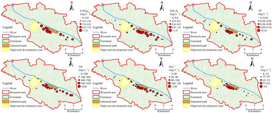 The concentration distributions of 6 conventional pollutants, including CODMn, NH3-N, TP, TH, SO42−, and Cl, in 26 groundwater samples are shown in Figure 4. The concentration of CODMn was high in the western areas of the industrial park, while the concentration of NH3-N was high in the southern areas of the industrial park and the farmland, which might be explained by applying fertilizers [52,53]. The concentration distributions of TP, TH, and SO42− were relatively similar, with higher concentrations near the industrial park and in farmland areas along the lower reaches of the river and lower concentrations in the river’s upper reaches.