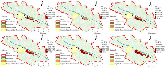 The concentration distributions of Zn, Ni, Cr, Cu, Mn, and Pb in the 26 groundwater samples are shown in Figure 5. Higher concentrations of these heavy metals were detected at sampling sites close to the industrial park, with gradual decreases along the Shiting River toward the downstream area. Heavy metal concentrations were deficient in upstream farmland areas farther from the industrial park. The concentration distribution map shows that pollutant discharges from the industrial park significantly impacted the distribution of heavy metals in the vicinity, which needs to be further analyzed through groundwater quality assessment.