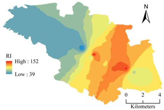 As shown in Table 5, the integrated potential ecological RI of the six heavy metals is 39.4–151.20, with a mean value of 97.27. Areas with a moderate integrated RI accounted for only 3.8% of the total surveyed area, while those with a low integrated RI accounted for 96.2%. A risk coefficient of less than 100 covered the largest area, 50.0% of the total surveyed area. The integrated potential ecological risk evaluation map of the six heavy metals (Figure 7) shows a high correlation with the spatial distribution of the heavy metal contents in shallow groundwater, especially the distributions of Cu and Pb. The above analysis indicates that the traditional industrial park poses a slight ecological risk to shallow groundwater in agricultural fields.