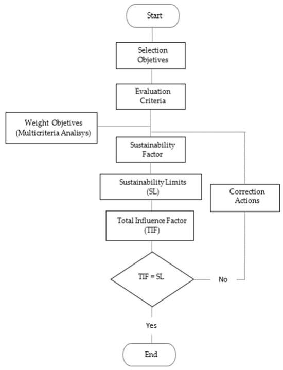 The proposed model is flexible because sustainability factors can be included or extracted depending on the planning of the evaluated infrastructure. It is only necessary to change the weighting or importance that each factor will have in the TIF. In brief, the methodological steps are the selection of objectives, sustainability factor evaluation criteria, calculation of sustainability limits (TIF), and application of corrective actions when necessary.