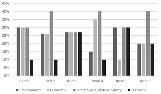 The comparison of the four objectives with the three factors of the sustainability pillars results in a direct relationship between the environmental and economic objectives and the environmental and economic sustainability factors. Regarding the social sustainability factor resulting from the comparison, it could be associated with the functional objective and road safety. The fourth objective, territorial, has been distributed homogeneously among the three sustainability factors.