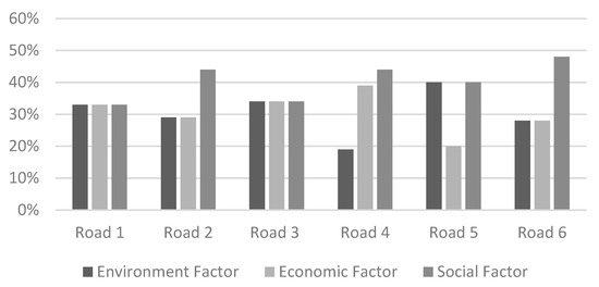 Table 4 and Figure 5 show the redistribution of the weights of the four objectives to the three sustainability factors.