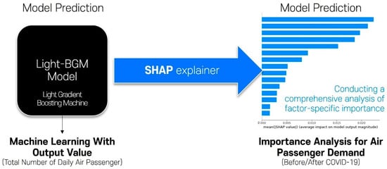 Detailed forecasts (correlation and causality) by year or month have been employed in the above-mentioned study on the significance and predictive analysis of air travel demand’s influencing factors. However, in the current situation, where the impact of COVID-19 is pervasive, the need for research on two research questions becomes apparent. The first question is, “How has the significance of the factors influencing air travel demand changed since the upheaval due to COVID-19?” The second question is, “How do microscopic analysis results, such as daily demand for representative variables, manifest themselves in the present with multi-criteria data-based analysis algorithms such as big data and artificial intelligence analysis?” Identifying and predicting significant factors in air travel demand can be carried out on the basis of air travel demand time-series data by year and month. However, they have limitations in terms of securing the optimal number of data samples and determining the structure of each influencing factor in the complex aviation industry. This study, therefore, uses the SHAP methodology, which is an algorithm for explaining the output of a machine learning (ML) model, to distinguish data-based multi-criteria influencing factors.