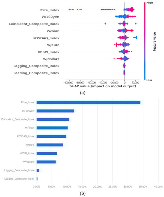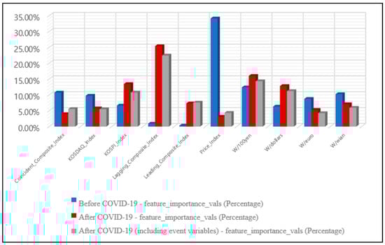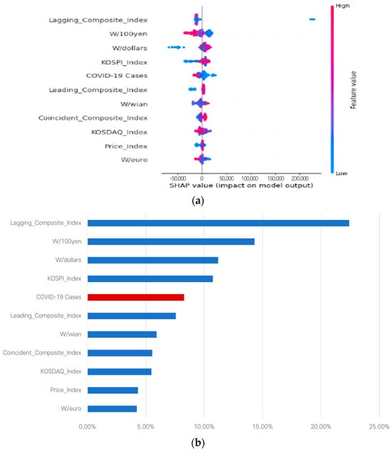 The results of the post-COVID-19 SHAP analysis with the pandemic variables (event variables) added are shown in Table 3. The composite index of lagging indicators with the highest value accounted for 22.41% of the total SHAP values, whereas the price index and the KRW/EUR exchange rate showed the lowest values with 4.32% and 4.23%, respectively. 8.27% of the total SHAP values was accounted for by the number of confirmed COVID-19 cases. It was determined that there are limitations to asserting that the addition of the variables in the number of confirmed cases significantly changed the overall level of significance.
