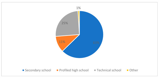 Among the respondents, the vast majority had a university degree (78%), the next largest group was respondents in the process of studying (19%), while a small percentage of people had secondary or other education (3% in total). The most commonly attended school was a general high school, attended by more than half of the respondents (63%), while one in four respondents attended a technical school (25%) and the fewest people attended a specialized high school (11%) or other type of high school (2%) (see Figure 2).