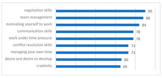 The soft skills most often mentioned in the literature include team management, ability to delegate tasks, negotiation skills, communication skills, conflict resolution skills, time management, motivation to work, willingness and drive to develop, creativity and ability to work under time pressure.