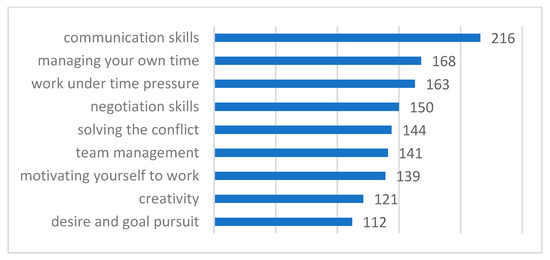 Giving a general answer to the question of whether any soft skills training classes were implemented during high school education and/or during college, it can be concluded that for the majority of people in the training of any of these competencies, classes were not implemented during formal education (there was a preponderance of negative answers for each competency surveyed). The detailed distribution of responses is presented in Table 3. Only in the area of developing communication skills did more than half of the respondents (52.1%) indicate that the training of this skill was implemented during education (see Table 3).