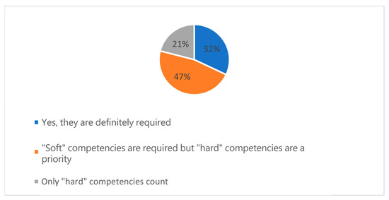 As indicated by the vast majority of respondents, the so-called formation of many needed soft competencies, so far, is not explicitly included in the educational process. This is especially true of the ability to collaborate virtually in an efficient manner and the ability to maximize cognitive functioning. As one might guess, the first of these competencies has begun to become increasingly important as the need for remote work becomes more widespread. The increase in the importance of soft skills in modern service sectors also shows a clear view among the surveyed employees that the formation of these skills should be included in mandatory teaching (almost 70%).