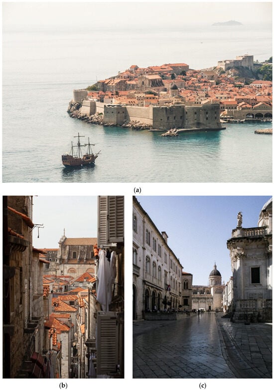Old City of Dubrovnik: (a) a view of the city from the southeast; (b) a street view in the residential part with the former Jesuit College in the distance; (c) a street view of City Hall, Rector’s Palace and the Cathedral (courtesy of the Institute for the Restoration of Dubrovnik [14]).