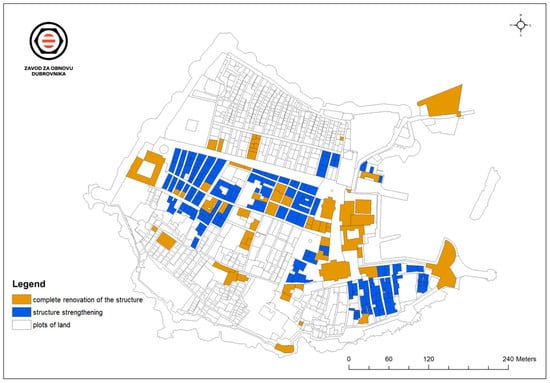 Map of the Old City of Dubrovnik showing the retrofitted historical monumental buildings before 1989 (colored in blue) after the very destructive 1979 Mw = 7.1 Montenegro earthquake of very strong intensity, i.e., IMCS = VII measured in the city (publicly available at URL: https://zod.hr/obnova-dubrovnika/potres-1979-i-aseizemicka-sanacija/; accessed on 2 June 2023).