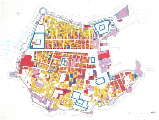 Urban plan of the Old City of Dubrovnik from 1982 (legend by color: yellow = residential buildings; pink = cultural; blue = management, administration, and economy; red and brown = tourism and stores) [47,48].