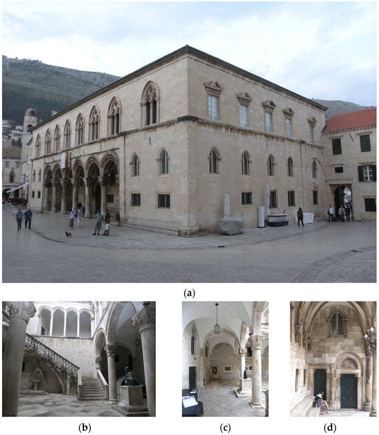 A view at the exterior and interior of the Rector’s Palace architecture: (a) south-west corner of the building; (b,c) atrium; (d) arcades (courtesy of the Institute for the Restoration of Dubrovnik [14]).
