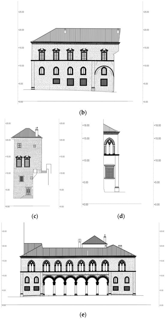 Facades of the Rector’s Palace with historical architectural details: (a) east; (b) south first; (c) south second; (d) north and (e) west façade view (courtesy of the Institute for the Restoration of Dubrovnik).