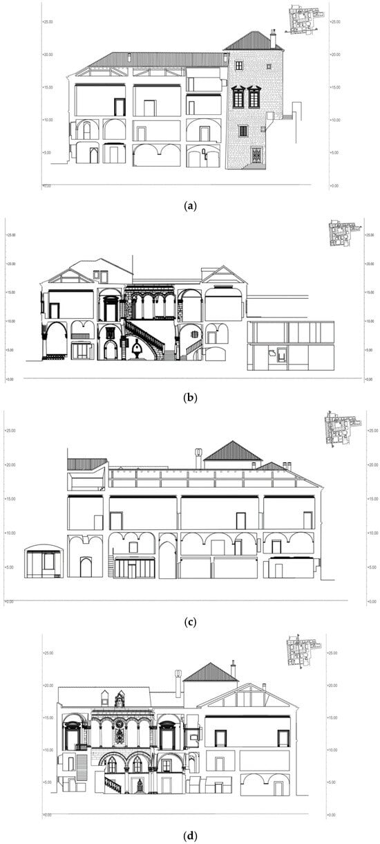 Selected cross-sections of the Rector’s Palace: (a) “2-2”; (b) “3-3”; (c) “6-6”; (d) “9-9” as specified in original architectural drawings (courtesy of the Institute for the Restoration of Dubrovnik).
