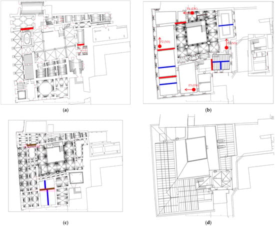 Floor plans of the Rector’s Palace after 1982–1984 retrofitting showing added/replaced (in red color) and removed (in blue color) stone masonry structural walls with reference to a pre-retrofitting design condition: (a) ground floor; (b) first floor including the position and the direction of the instruments used for ambient vibration measurements; (c) mezzanine; (d) attic (courtesy of the Institute for the Restoration of Dubrovnik).