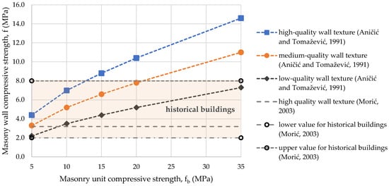 where K is constant with a value of 0.45 for dimensioned natural stone; fb is normalized compressive strength of a masonry unit; and fm is the compressive strength of a mortar, ranging from 1.83 MPa (for fb = 5 MPa and fm = 2.5 MPa) to 8.8 MPa (for fb = 35 MPa and fm = 5.0 MPa), which corresponds to limits shown in Figure 9 as defined in [54,55].