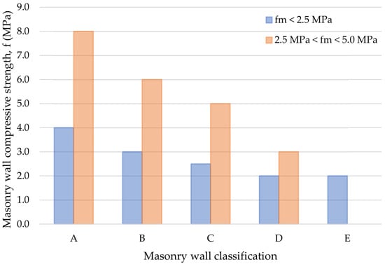 In addition, Figure 10 shows the compressive strength of natural stone masonry walls made with lime fm < 2.5 (MPa) or cement–lime mortar, 2.5 < fm < 5.0 (MPa), belonging to the eastern Adriatic coast with reference to wall classification (A–E) as proposed by [54,55] where letter symbols refer to (A) designates walls made of finely dressed and properly arranged stone blocks, without intermediate layers; (B) walls made of large regularly dressed stone blocks with a relatively narrow central layer filled with fill material and stone chippings; (C) walls made of large irregularly dressed stone blocks with a relatively narrow central layer filled with fill materials and stone chippings; (D) walls made of roughly dressed irregular stone blocks with a large number of stone chippings and fill material in the central layer, and with irregular joints; and (E) walls made of undressed stone with a large quantity of fill. According to the EN 1996-1-1:2005 [24] building code, the wall compression strength estimate is based on the constituent contribution, i.e.,