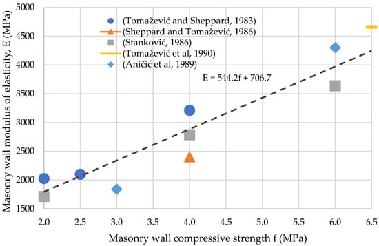 The references [13,58,59,63,65,66] are particularly related to the characteristics of the Rector’s Palace construction. The earthquake design requires the appropriate modulus of elasticity E, which can also be expressed in terms of compressive strength f of masonry walls (B class in the case of Rector’s Palace). The modulus of elasticity, besides the structure’s mass, is critical in the calculation of the natural frequency of the building and, therefore, the earthquake performance. The adequate modulus elasticity was determined by structural model calibration with reference to measured natural frequencies. The initial, i.e., orientation values of the modulus of elasticity of natural stone masonry walls made with lime mortar, E (MPa), belonging to the eastern Adriatic coast with reference to corresponding wall compressive strength, f (MPa), from test results, as given by [54,55,60,61,62,63,64], are shown in Figure 11 and Table 1. As proposed by [54,55], and based on Figure 11 and Table 1 information, the lower limit (referring to walls of low-quality texture) of the modulus of elasticity can be expressed as E = 650 × f (MPa), while the upper limit (referring to walls of high-quality texture) as E = 900 × f (MPa), which is lower than the prediction E = 1000 × f (MPa) given in the EN 1996-1-1:2005 [24] building code. The corresponding value of stone masonry wall shear modulus G ranges from E/6 to E/4. In addition, the recommended values of stone masonry wall tensile strength ft range from 0.09 to 0.3 MPa in relation to corresponding compressive strength ranging from 2.0 to 8.0 MPa, respectively.