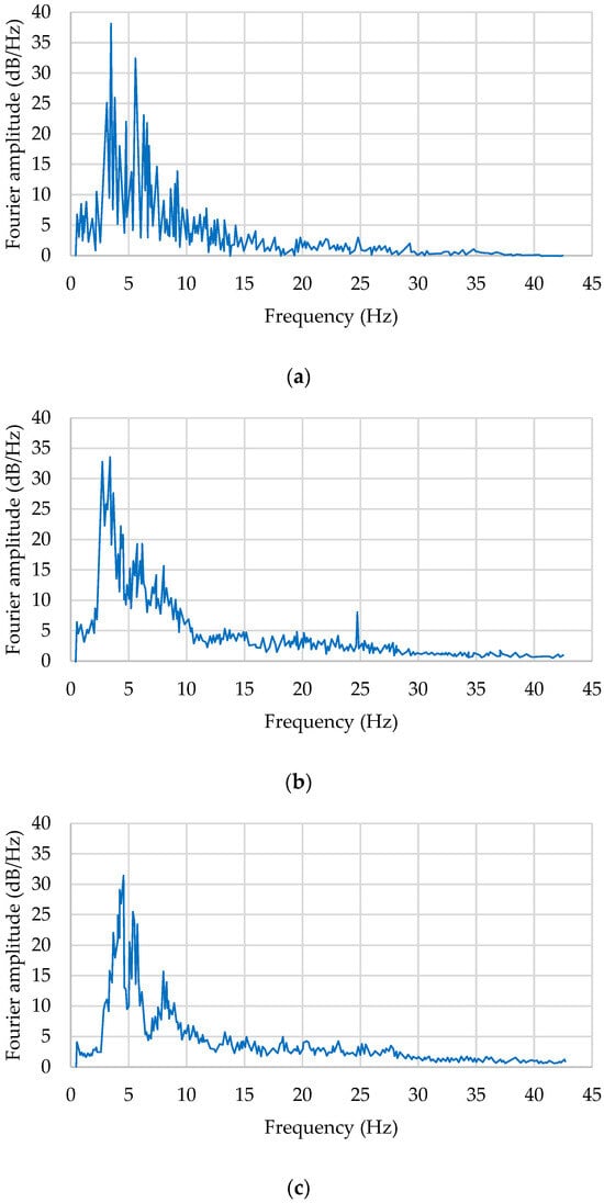 Example of Fourier amplitude spectra obtained via ambient vibration measurement in Rector’s Palace for (a) N-S direction, (b) E-W direction, and (c) torsion, as given in [67].