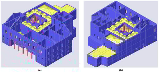 Finite element model of Rector’s Palace built in a computer program SCIA ENGINEER [70]: (a) southwestern view and (b) northeastern view of the building.