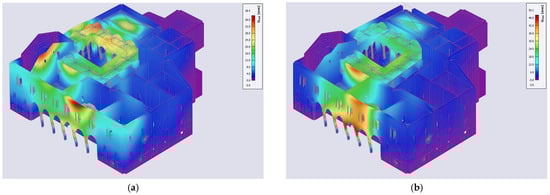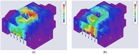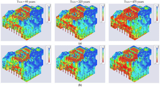 Spatial displacement distribution in mm on Rector’s Palace for the reference return period of TNCR = 475 years: (a) load combination—LC1; (b) load combination—LC2.