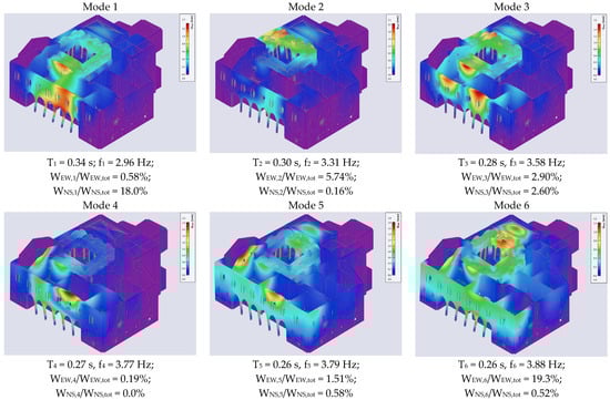 The fundamental period of Rector’s Palace for a: (a) pre-retrofitted condition T1 = 0.37 s, f1 = 2.72 Hz, WEW,1/WEW,tot = 3.6%, and WNS,1/WNS,tot = 10.0%; (b) post-retrofitted condition T1 = 0.34 s, f1 = 2.96 Hz, WEW,1/WEW,tot = 0.58%, and WNS,1/WNS,tot = 18.0%.