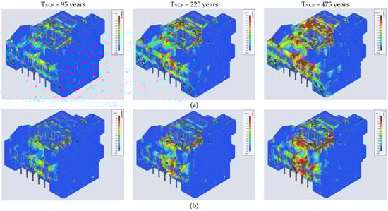 Principal tensile stresses, σ1 (MPa), on the Rector’s Palace, at reference return periods, TNCR, of 95, 225, and 475 years: (a) load combination—LC1; (b) load combination—LC2.